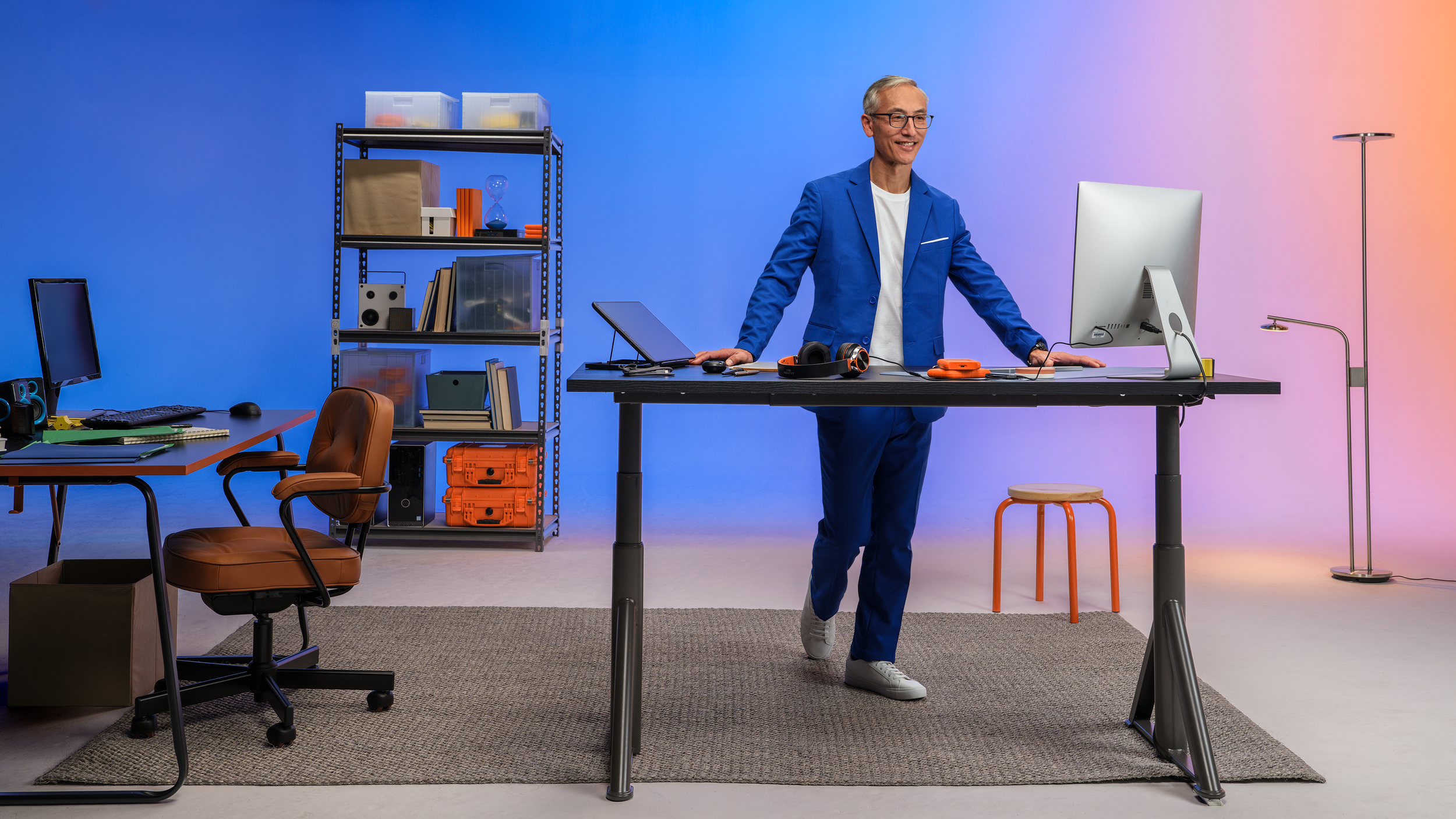 The conceptual foundation was in place: a practical effects-based shoot that would place small business owners directly inside the AWS world. We built a real environment on a sound stage lit with the soft blues, pinks, reds, and violets that define the AWS brand palette. We designed a series of four “floating” offices and populated them with different types of small business owners.